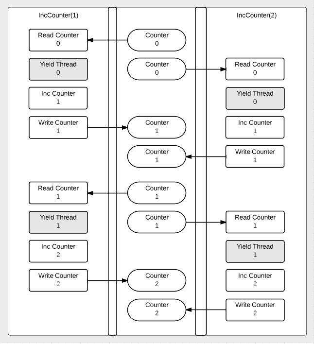Sơ đồ minh họa hai tiến trình (hoặc luồng) là IncCounter(1) và IncCounter(2) cùng truy cập vào một vùng nhớ dùng chung chứa biến Counter.